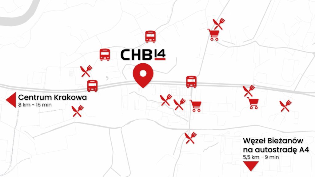 Lokalizacja CHB14 przy ulicy Christo Botewa 14 to doskonała propozycja dla firm poszukujących łatwego dostępu do kluczowych punktów w Krakowie. Budynek znajduje się w pobliżu głównych arterii komunikacyjnych, co umożliwia sprawny dojazd zarówno samochodem, jak i komunikacją miejską. Niewielka odległość od węzła Bieżanów na autostradę A4 zapewnia szybkie połączenie z innymi miastami w Polsce, a to istotny atut dla firm o zasięgu krajowym i międzynarodowym.Rozwiń ∨